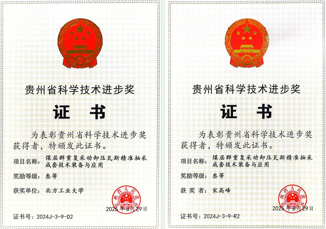 近日,贵州省人民政府颁发了2024年度贵州省科学技术进步奖证书。我校土木工程学院教师宋高峰参与的科研成果—“煤层群重复采动卸压瓦斯精准抽采成套技术装备与应用”获得了贵州省科学技术进步三等奖。宋高峰老师为该项成果的第二完成人,我校为第二完成单位。