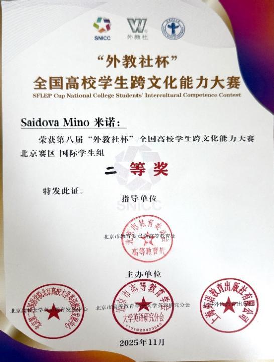 11月1至2日,第八届“外教社杯”全国高校学生跨文化能力大赛北京赛区在首都医科大学圆满落幕。我校国际学院选派的留学生团队凭借扎实的跨文化素养、出色的团队协作与创新的案例呈现,从38所高校参赛的46支组中荣获留学生组二等奖。