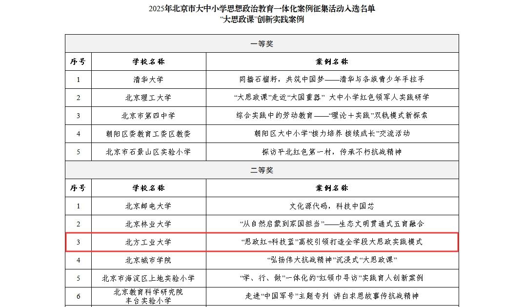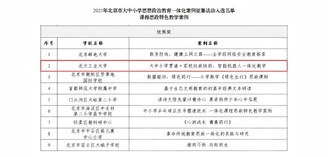 近日,2025年北京市大中小学思想政治教育一体化主题活动案例征集评审结果公布,我校机械与材料工程学院申报的《“思政红+科技蓝”高校引领打造全学段立体化大思政实践模式》获“大思政课”创新实践案例二等奖,电气与控制工程学院申报的《大中小学贯通·家校社政协同:智能机器人一体化教学》获课程思政特色教学案例优秀奖。