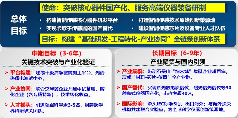 实验室以突破核心器件国产化、服务高端仪器装备研制为使命,聚焦自主知识产权的传感器核心部件,突破纳米结构设计与表面修饰技术等关键核心技术,研究关键部件重复性和稳定性提升机理,推动高端科学仪器核心部件在高性能、高精密科学仪器领域示范应用。打通“理论创新—关键材料/技术突破—智能传感应用”的关键材料环节,构建“基础研发-工程转化-产业协同”全链条创新体系,打造北京市高性能传感器优势团队,引领北京市科学仪器核心部件自主发展和产业升级。”