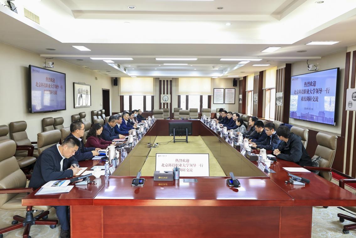 张启鸿对董竹娟一行来校交流表示欢迎。他指出,学校高度重视与北京科技职业大学的合作关系,希望双方进一步拓展合作领域,推进教育、科技、人才一体融合发展,落实立德树人根本任务,提升人才培养质量,深化师生交流互动,全力打造“本科——高职”合作的示范标杆,共同书写两校携手发展的崭新篇章。