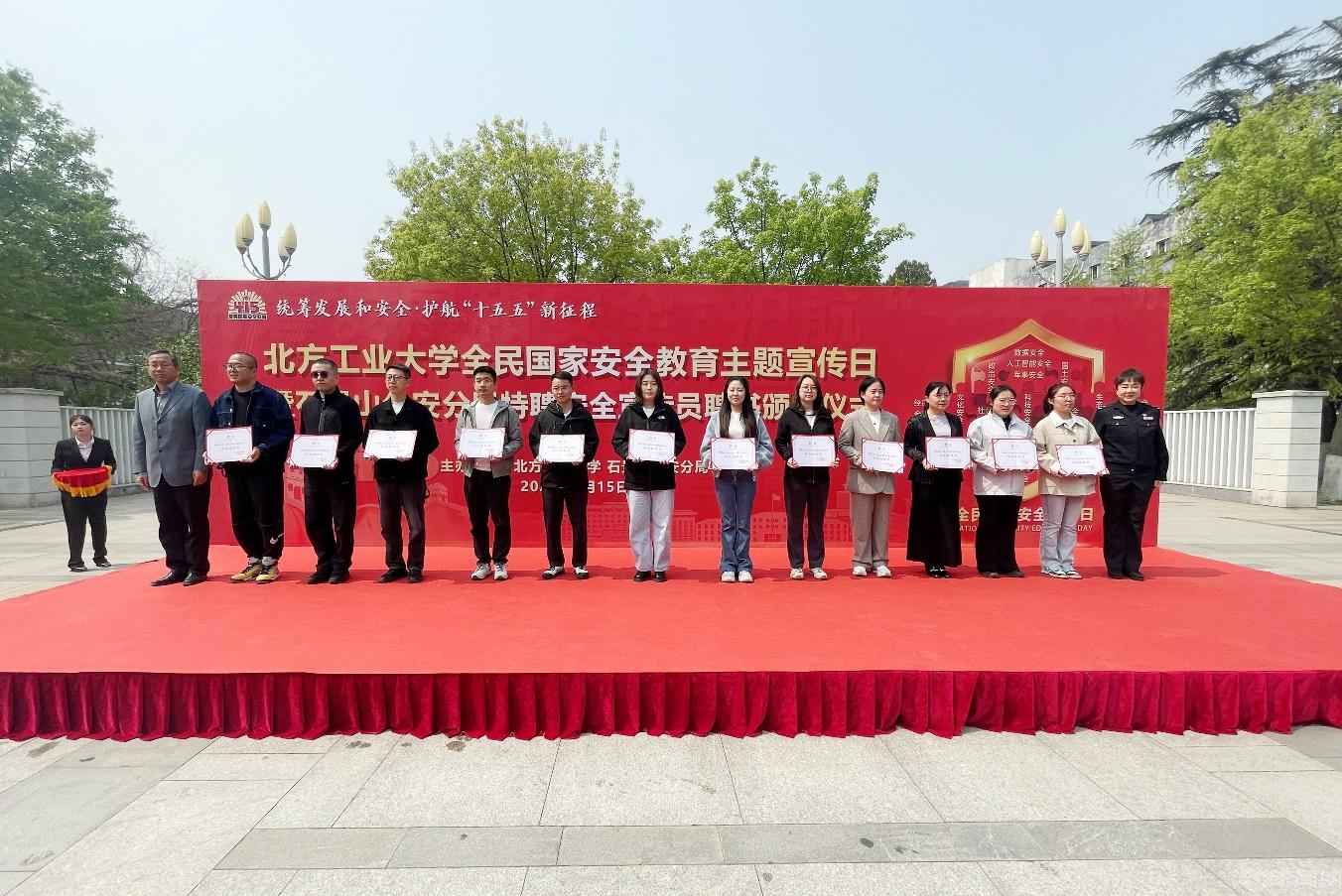 4月15日中午,学校联合石景山区公安分局,在毓秀广场举办北方工业大学全民国家安全教育主题宣传日暨石景山公安分局特聘安全宣传员聘书颁发仪式活动,师生代表300余人参加。党委副书记史贞军、石景山公安分局副局长白鸥出席活动,并为安全宣传员颁发聘书。