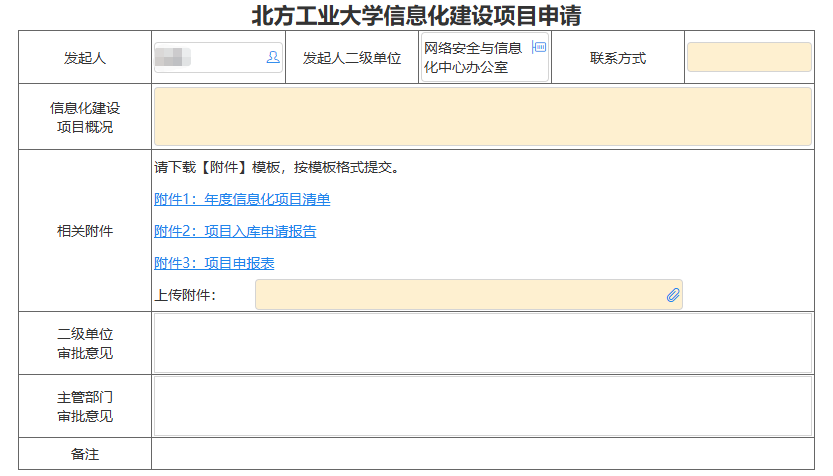 1.登录OA系统,填写《北方工业大学信息化建设项目申请》表单(见图1),并在表单内以附件形式提交《年度信息化项目清单》以及《项目申报表》。