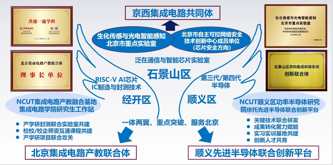 2024年10月,北京大学集成电路学院与北方工业大学集成电路学院“1+1”共建一流学科,同时作为北京集成电路产教联合体理事长单位入驻北京集成电路产教融合基地建设,设立“北方工业大学集成电路学院研究生工作站”。