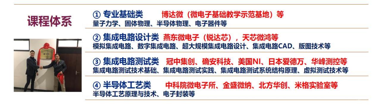 课程建设方面,结合产研需求,强化数智赋能。学院建立集成电路设计、芯片制造、封装及测试全产业链课程体系,分设 4 个课程群,每个课程群建立对应的实习实训基地。集成电路测试作为特色课程群,具有国内最完备的集成电路测试课程体系。将专业课程划分为校内课程、校企共建课程、企业课程3 类,联合头部企业,荟聚全国集成电路企业、科研院所及高校的优质师资力量,联合开发全产业链的数智化课程资源库,涵盖近 800 学时、20 余门专业在线课程,尤其是基于真实集成电路生产线环境开展浸润式实景、实操、实地教学模式。课程内容紧扣标准国家职业技术标准,内容涵盖初级、中级和高级3个层次,适用于不同阶段的学生和工程师,通过课程考核后可获得工信部认证的职业能力证书并纳入国家人才库。