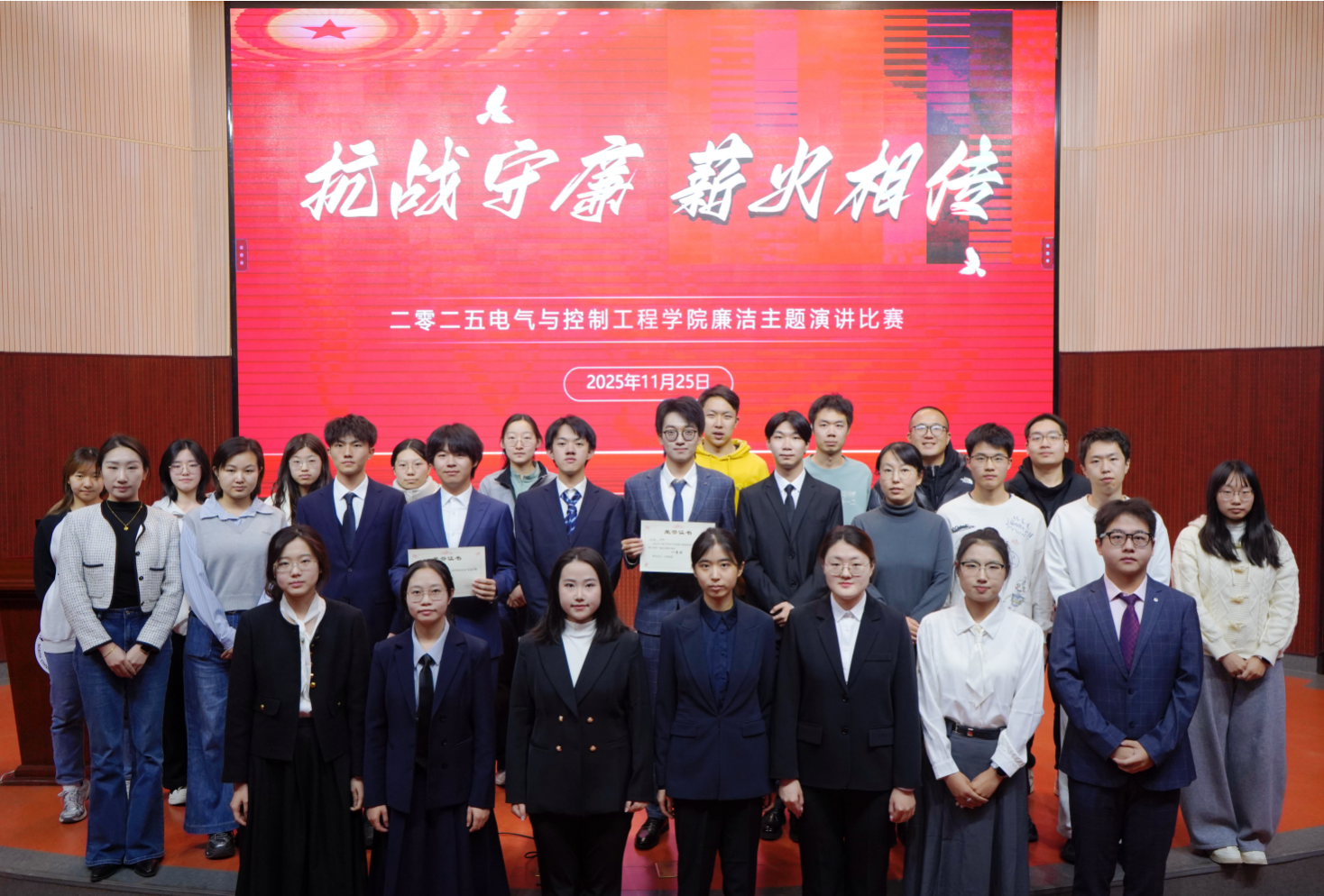 11月25日,电控学院“抗战守廉,薪火相传”廉洁主题主题演讲比赛在文化会堂举办。学院党委书记李颖宏、学院党委副书记刘霁炜以及辅导员及研究生会代表,以及25级新生参加活动。院党委书记李颖宏致开场词,她讲到“抗战守廉,薪火相传”不仅是对峥嵘岁月的缅怀,更是对当代青年的精神召唤。她指出,在民族存亡之际,先辈们以廉洁自律、艰苦奋斗凝聚人心、赢得胜利;而在今天,这份“廉”更应落实于青年的日常修为之中——体现为...