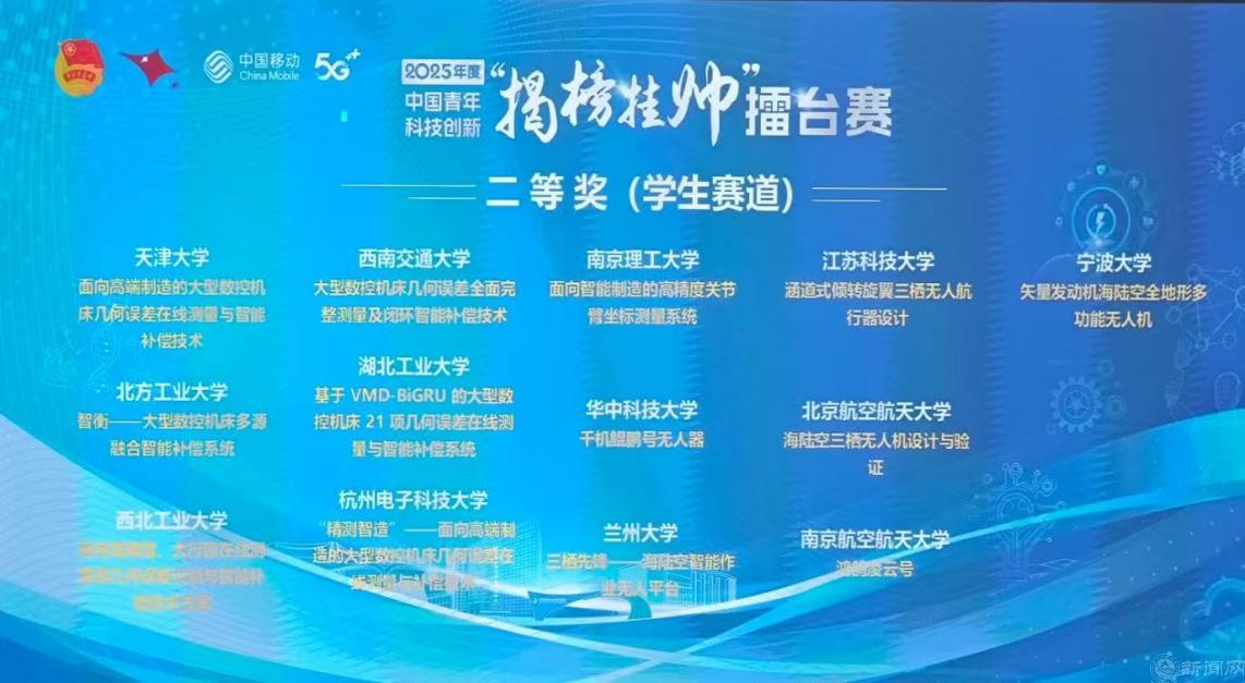 近日,由共青团中央、中国科协、教育部、中国社会科学院、全国学联联合主办的2025年度中国青年科技创新“揭榜挂帅”擂台赛高端装备领域主擂台赛在湖南长沙市举行。我校学生创新团队凭借自主研发的“智衡——大型数控机床多源融合智能补偿系统”项目从来自全国121所高校的302支顶尖团队、近千名科创青年中突围,荣获学生赛道全国二等奖。