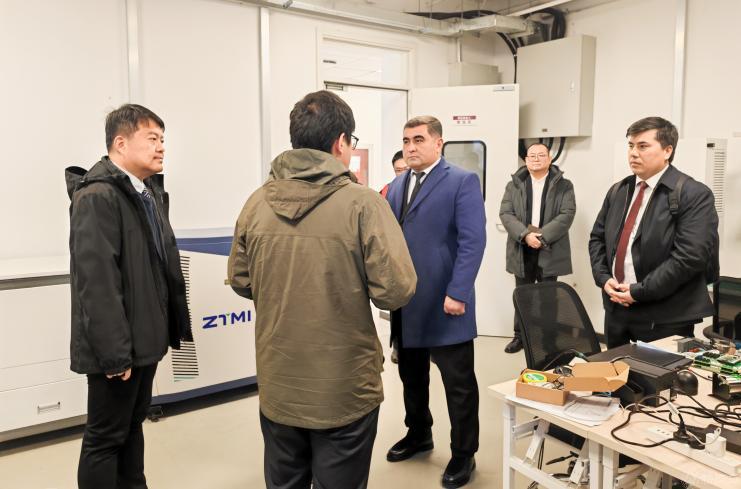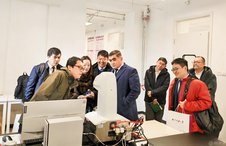我校电气与控制工程学院、储能科学与工程学院、国际合作与交流处相关负责人及教师参与座谈。来校期间,图尔迪亚利耶夫校长参观了电力电子与电气传动、电力系统与继电保护、新能源发电与微电网,电机拖动实验室以及分析测试中心。