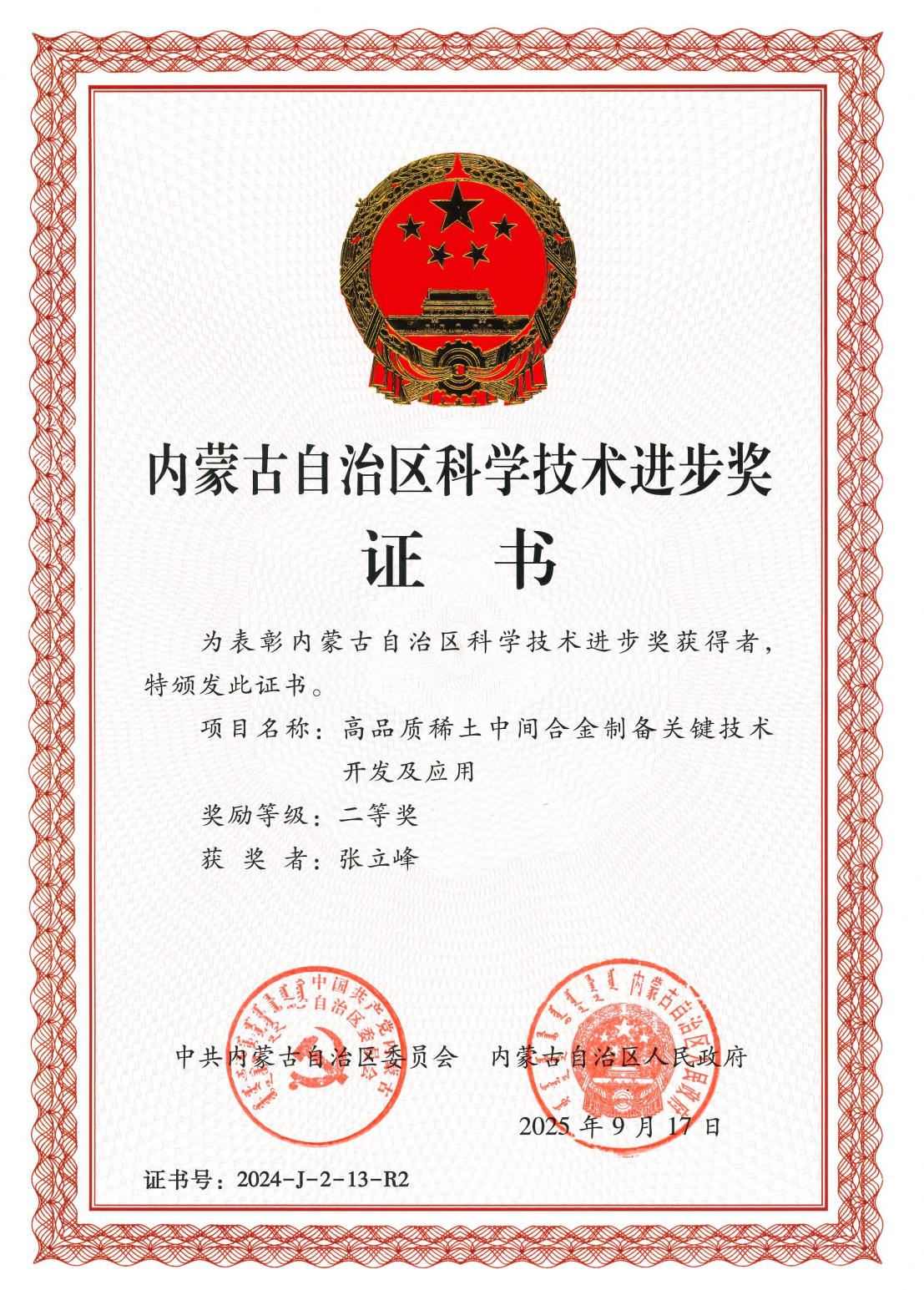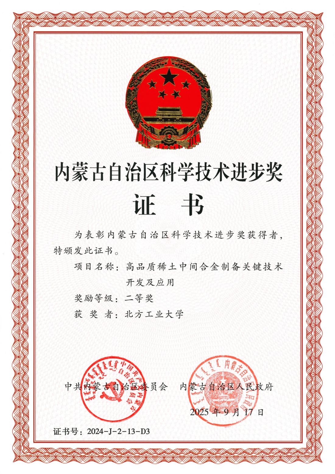 近日,内蒙古自治区党委、人民政府联合印发《关于2024年度自治区科学技术奖励的决定》,由包头稀土研究院牵头,张立峰校长为第二完成人,我校为第三完成单位的“高品质稀土中间合金制备关键技术开发及应用”项目,凭借在稀土功能材料与钢铁材料融合领域的突破性创新,荣获2024年度内蒙古自治区科学技术进步奖二等奖,标志着我校在稀土-钢铁跨领域技术协同创新中取得重要突破,为国家高端材料产业发展与自治区经济高质量升级提供有力科技支撑。