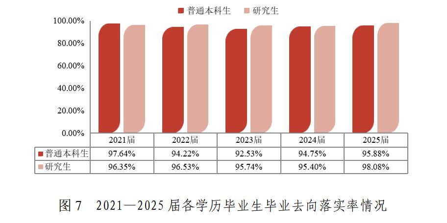 学校毕业生规模逐年递增,2025届毕业生总数达4561人。学校毕业生去向落实率保持稳定。2025届研究生毕业去向落实率达98.08%,普通本科生(不含二年制本科)落实率95.88%。