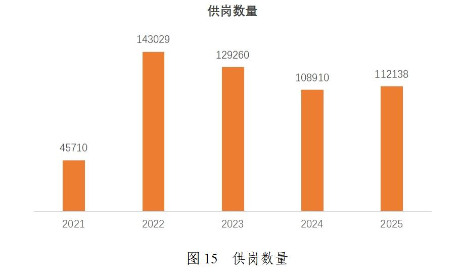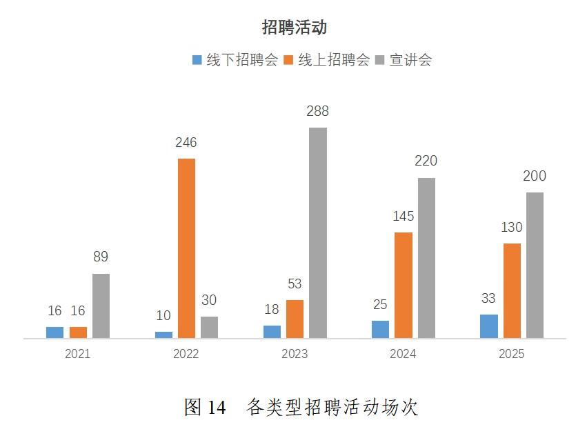 学校构建了全员参与、全程、全方位的就业服务体系。“十四五”期间,线下招聘会从2021年的16场增至2025年的33场,线上招聘会最高年举办246 场,宣讲会年均举办超200场,累计为毕业生提供岗位54万个。