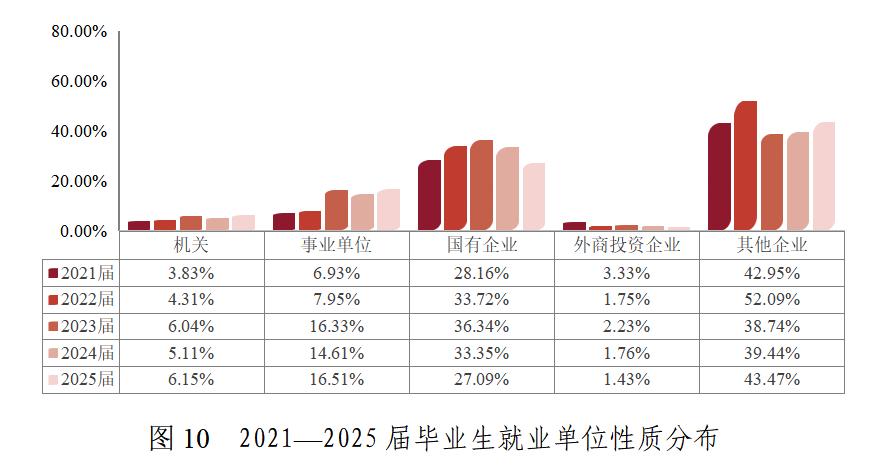 从单位性质来看,企业是我校毕业生就业主阵地,合计吸纳超七成毕业生。近三年毕业生到事业单位就业的比例显著上升,约占16%。