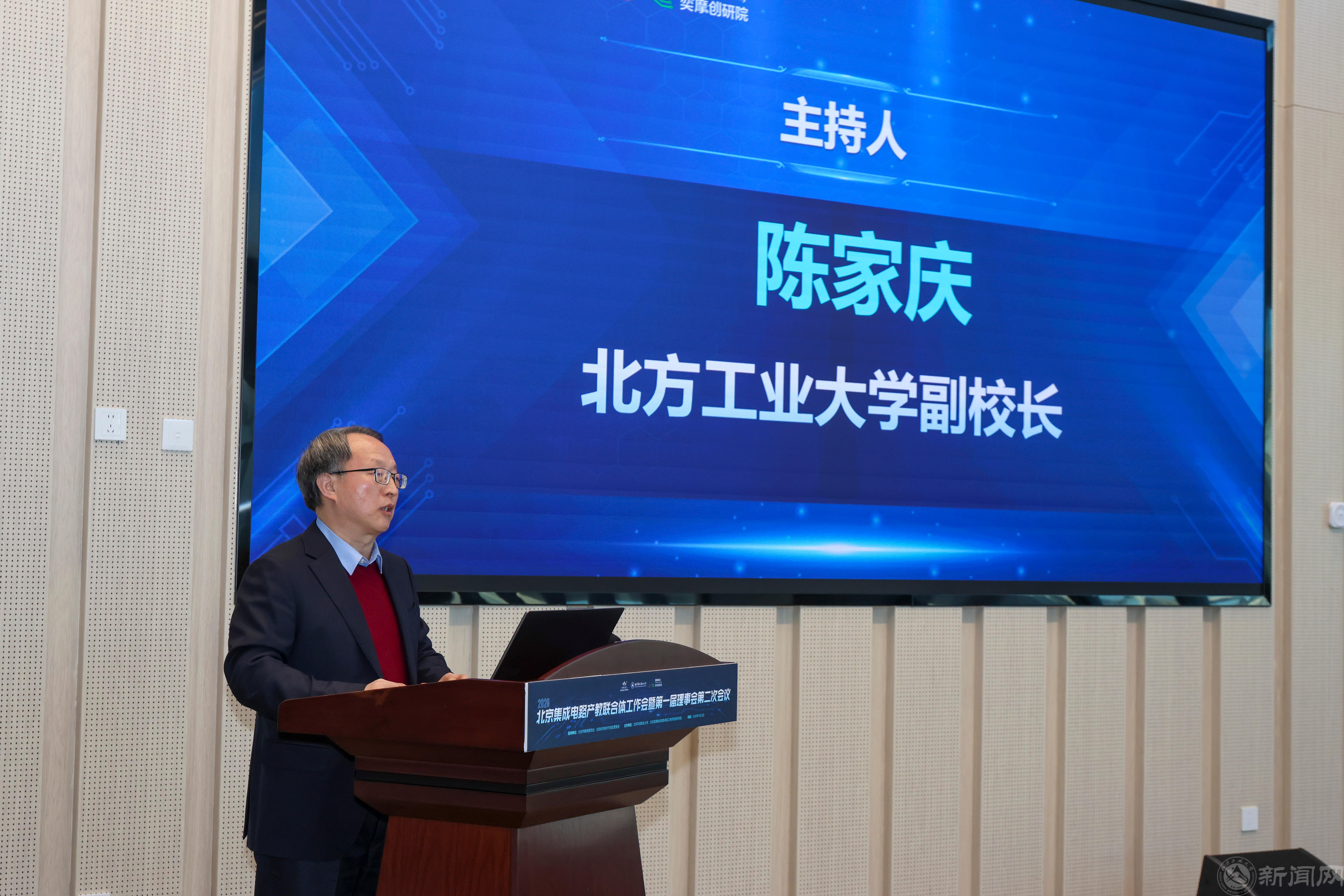 1月23日,北京集成电路产教联合体2026年度工作大会暨第一届理事会第二次会议在北京集成电路产教融合基地隆重举行。北京市委教育工委委员、北京市教育委员会副主任张耀天,北京经济技术开发区管委会副主任沈金坤,北京科技职业大学校长王伟,北方工业大学党委常委、副校长陈家庆出席。来自北京航空航天大学、北京理工大学、北方工业大学等10所联合体高校集成电路相关院系的负责人,以及北方集成电路创新中心、北方华创、中芯国际等20余家联合体建设参与企业的负责人参加会议。陈家庆作为首届轮值理事长单位的与会领导,主持了第一个环节的会议。