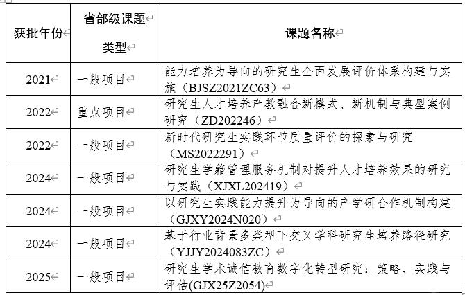 坚持分类培养理念,探索学术学位与专业学位研究生差异化发展路径。学术学位培养以孕育原始创新能力为根本,依托国家级重大科研平台、高水平科研团队和基础研究项目,强化学术素养与科研攻关能力训练。专业学位培养以解决复杂实际技术问题为导向,深化产教融合,通过共建课程、共导项目、共评成果,突出职业胜任力与工程实践力的培养。在此基础上,建立与分类培养相适应的差异化评价体系,在课程考核、实践环节、论文评审、学术成果认定及学位授予等环节实施分类标准,保障人才培养质量。2023-2025年累计立项校级研究生教学教改项目83项(含重点项目20项),获批省级研究生教改课题7项。