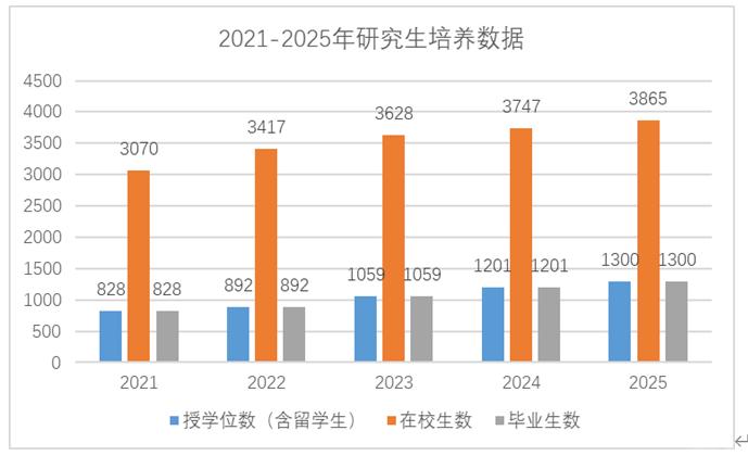 “十四五”期间,学校适度扩大研究生招生规模,全日制博士生、学术学位硕士生、专业学位硕士生招生人数均逐年增长。其中博士生从2024年的28人直接增至2025年的78人;学术硕士从2021年的421人增至2025年的462人,总增长率为9.74%;专业硕士研究生从2021年的719人增至840人,增长率达16.83%。