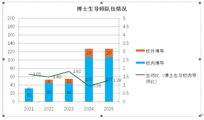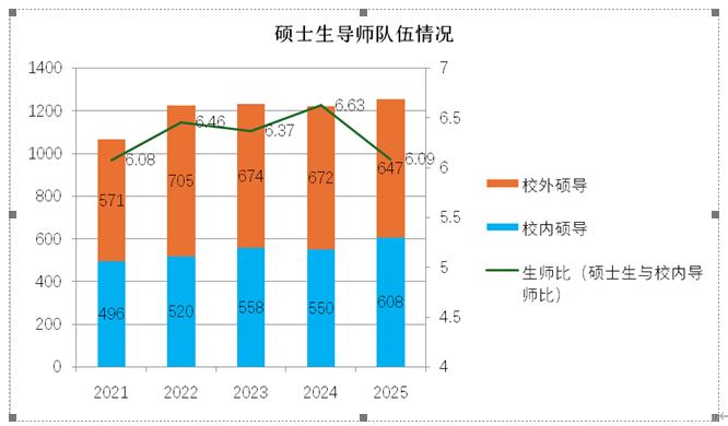 为支撑博士学位授予单位建设,学校博士生导师队伍实现跨越式增长。至2024年博士生导师总数达127人(2025年尚未最终确定),较2021年增长297%。硕士生导师队伍规模稳定增长,2025年为1255人(含校外导师)。其中,来自其他高校的校外导师178人,占校外导师人数的27.51%,来自企业的校外导师469人,占校外导师人数的72.49%。博士的生师比为1.28:1,硕士生师比为6.09:1,生师比近五年基本保持稳定,为研究生培养质量提升提供了关键的师资保障。