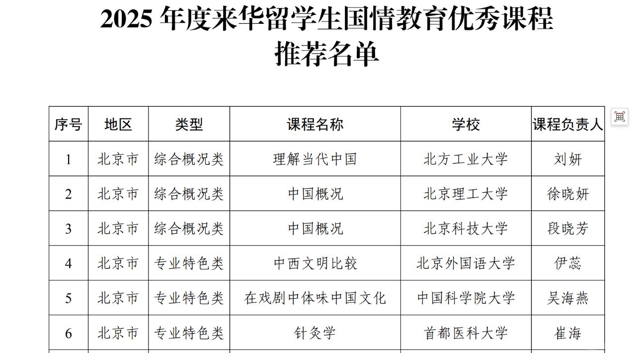 日前,受教育部国际合作与交流司委托,中国教育国际交流协会公布了2025年度来华留学生国情教育优秀课程评选结果。我校国际学院《理解当代中国》课程成功入选,是北京市入选的6门来华留学国情教育优秀课程之一,也是唯一入选的北京市属高校概况类课程。