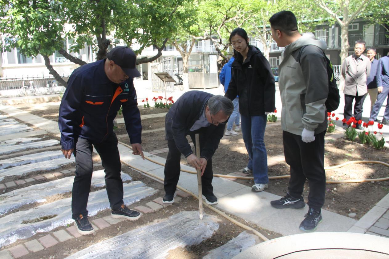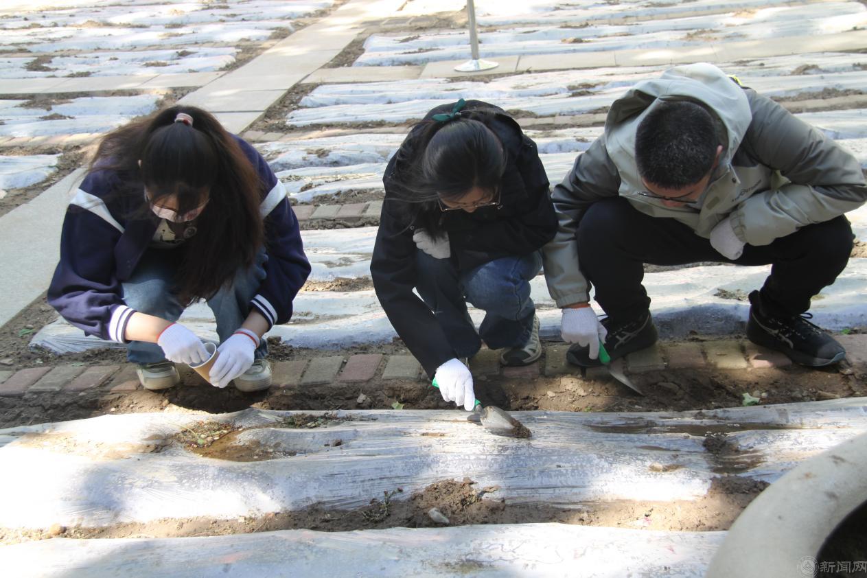 同学们在绿化师傅的指导下,拿起农具,翻整土地、播种栽苗、培土浇水,分组种植了辣椒、西红柿、豆角和黄瓜等蔬菜。师生们一同劳动,有的用细土轻轻覆盖种苗,有的提着水桶为刚种下的幼苗浇水,分工有序,干劲十足。