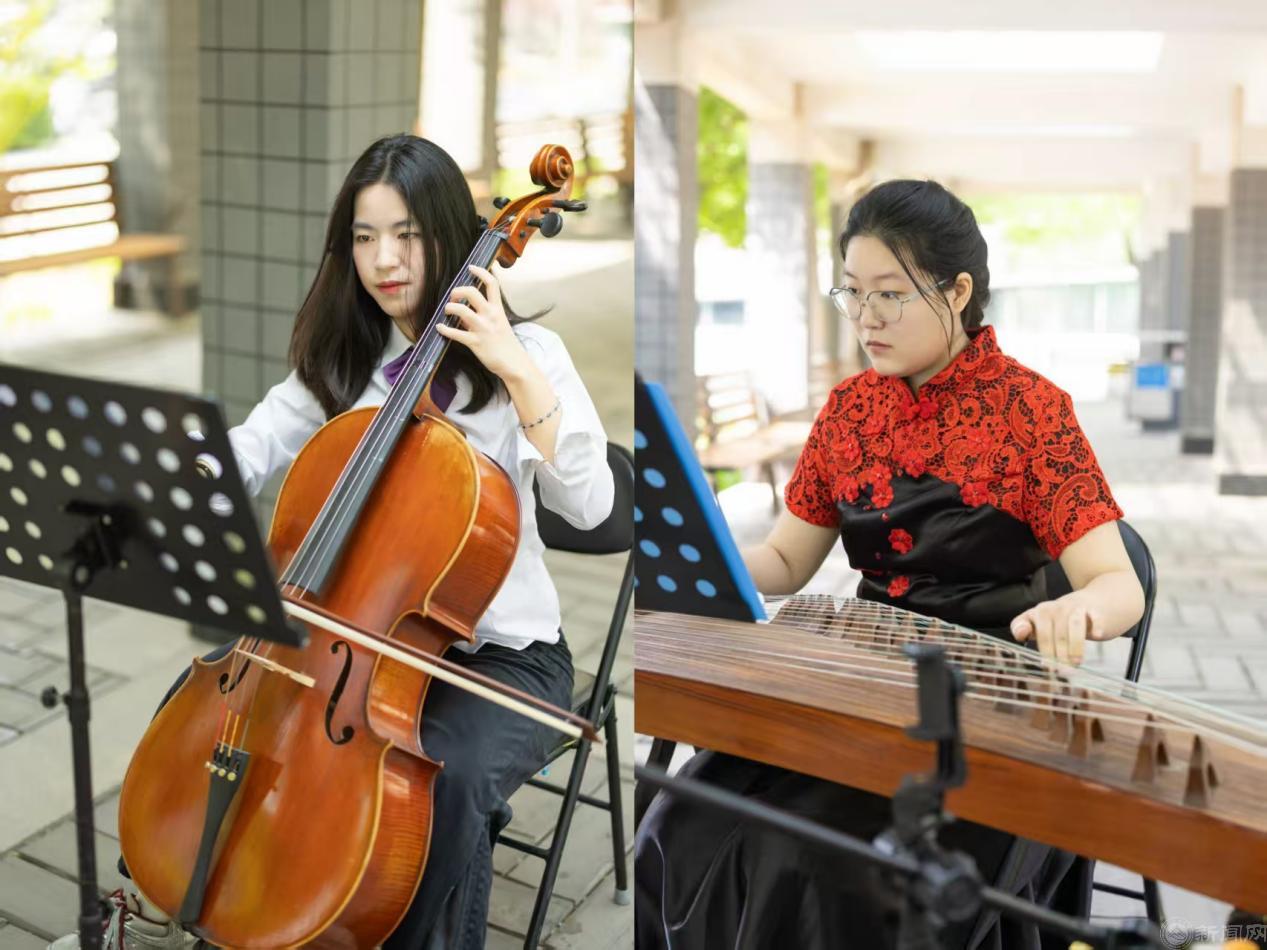 活动在学生演奏古筝名曲《浏阳河》《渔舟唱晚》《彝族舞曲》与大提琴演奏《巴赫无伴奏第一号组曲-前奏曲》《Always With You》《The Rain》等曲目的悠扬旋律中进行。