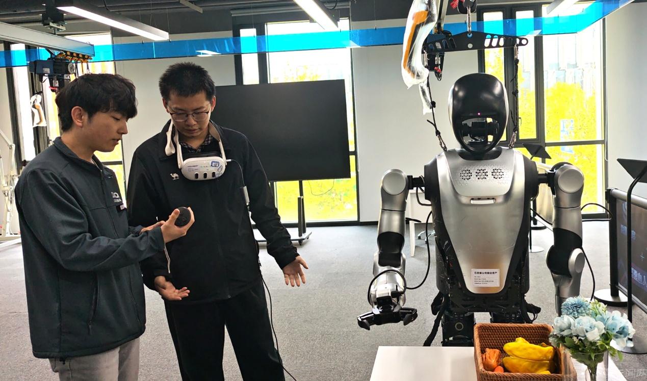 石景山人形机器人数据训练中心是国内最大的人形机器人数据训练场,涵盖16个应用场景。吴海楠首先介绍了训练中心基本情况,以及VR采集套件、动捕服、触觉传感器、视觉传感器(双目视觉摄像头、激光雷达)、末端执行器(二指夹爪、灵活手)等机器人数据训练常规配置,然后带领师生依次走进各模拟实景空间,近距离观摩在真实应用场景中机器人数据训练全过程。在互动体验区,王天剑带领师生进行了机器人抓取办公、生活物品实操。师生们通过VR操控手柄实时下达指令,机器人快速完成精准抓取动作,赢得现场一致赞叹。