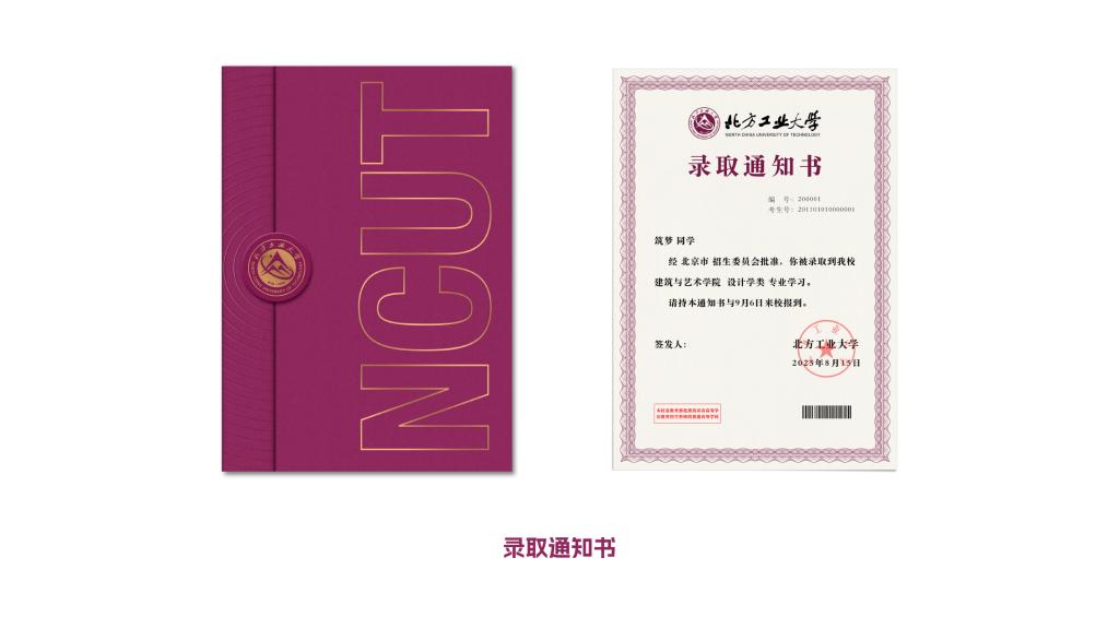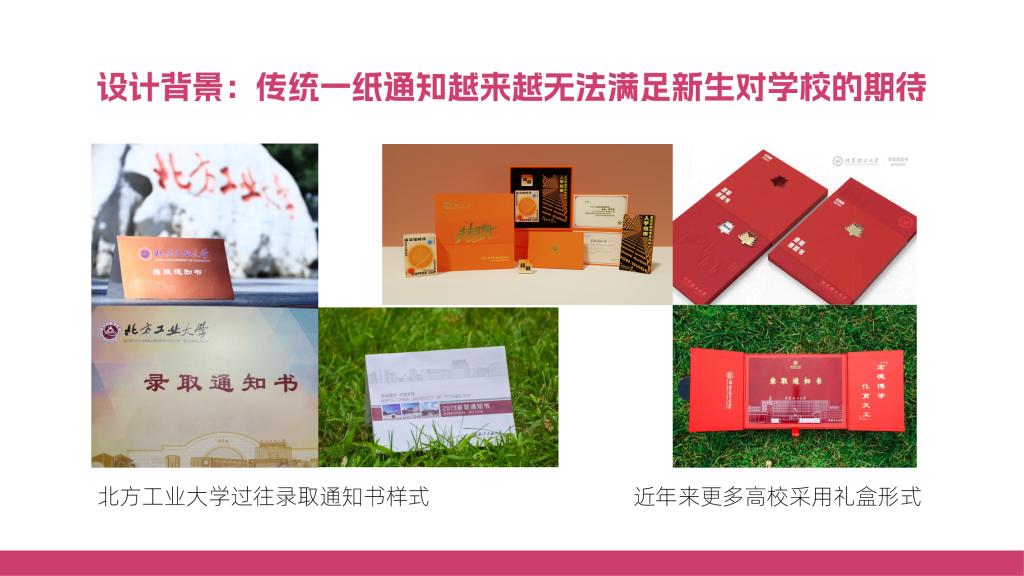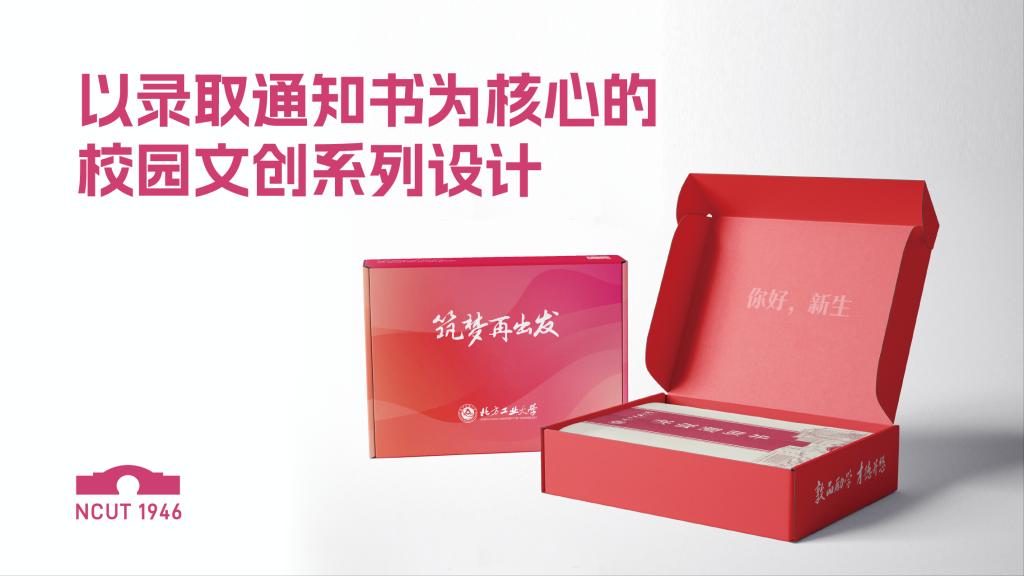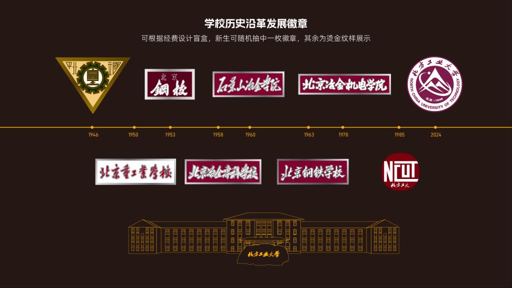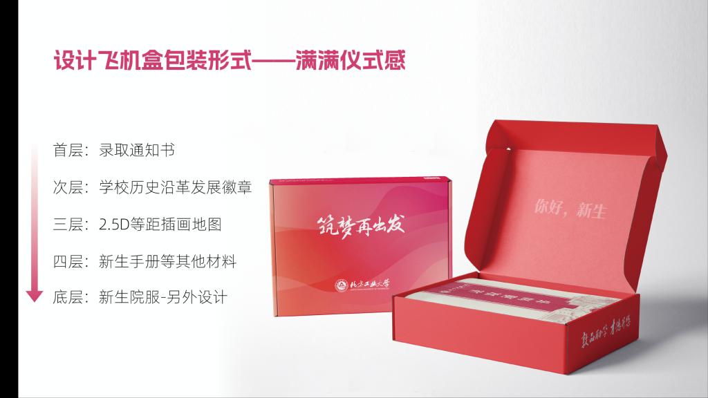 设计优化传统“一纸通知书”的单调,改特快专递信封为物流飞机盒,将新生开学所需的必需品“应装尽装”,通知书、新生地图、新生院服等等均可在礼盒中找到。创造性融入北方工大“兴工报国”传统,将代表学校发展历程的历枚徽章复刻,制作徽章盲盒,新生可随机抽取一枚实体徽章,切实感受工大近八十年历史,让承载着“兴工报国”传统的工大校史成为每一个工大人的必修课。