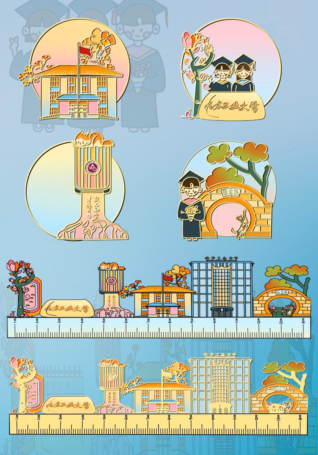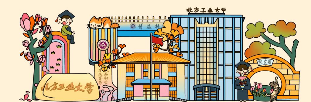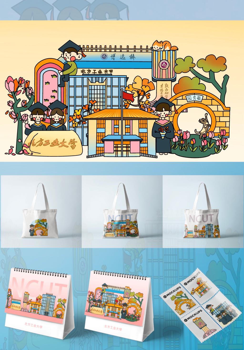 设计作品以北方工业大学建筑物为主,巧妙融合校园元素,通过精美插画展现学校风采。画面聚焦特色建筑,配以学位服学生,彰显学术氛围。色彩鲜明,充满活力,既体现了北方工业大学的庄重与温馨,又展现了其独特的文化魅力。