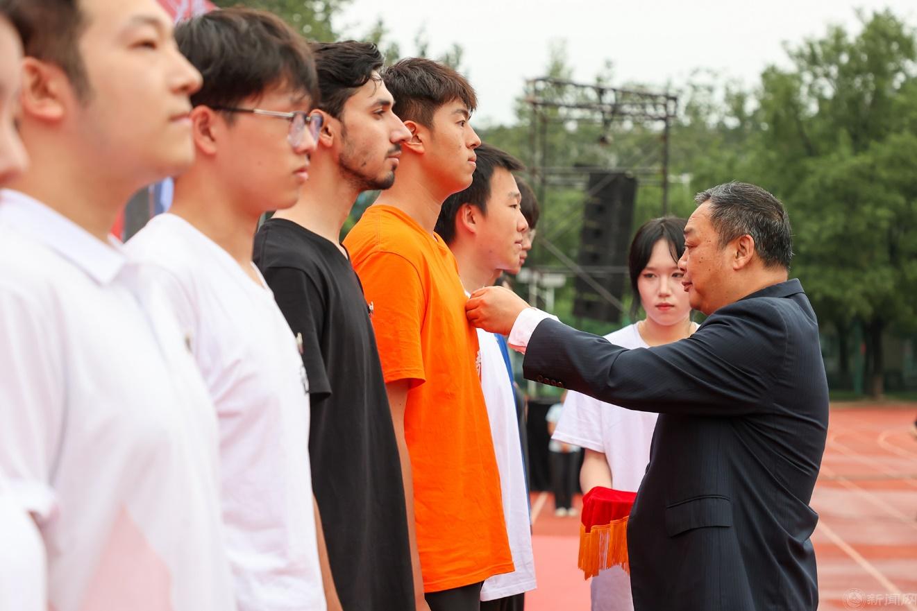 校党委书记刘军为新生代表佩戴校徽,欢迎2024级新同学缘聚北方工大大家庭,开启人生新征程。