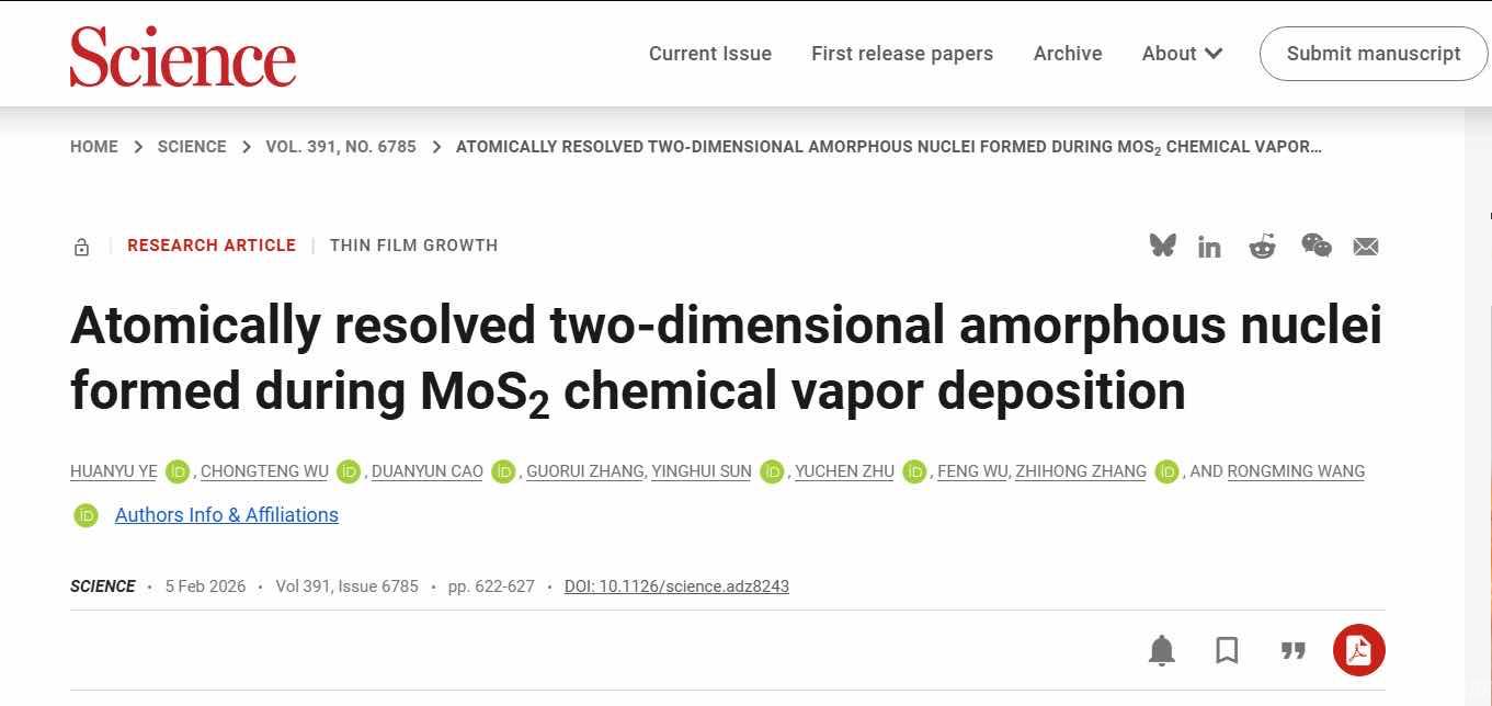 近日,我校机械与材料学院新入职教师叶欢宇在《science》发表第一作者论文。叶欢宇博士2025年12月自北京科技大学博士后出站入职我校。在北京科技大学新金属材料全国重点实验室博士后工作期间,其所在研究团队首次在原子尺度实时观测到化学气相沉积(CVD)过程中二维晶体二硫化钼(MoS2)的成核与生长行为,证实形核路径中存在二维非晶中间体,揭示二维晶体的非经典多步成核路径,颠覆了传统成核理论对二维体系的认知。2026年2月5日,相关成果以“原子尺度揭示二硫化钼化学气相沉积过程中形成的二维非晶核”(Atomically resolved two-dimensional amorphous nucleiformed during MoS2 chemical vapor deposition)为题,在线发表于《科学》(Science)杂志2026年391卷6785期。